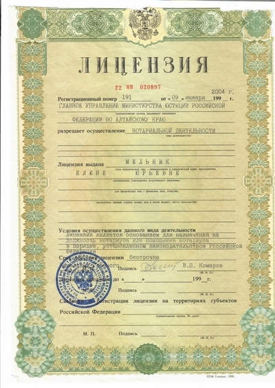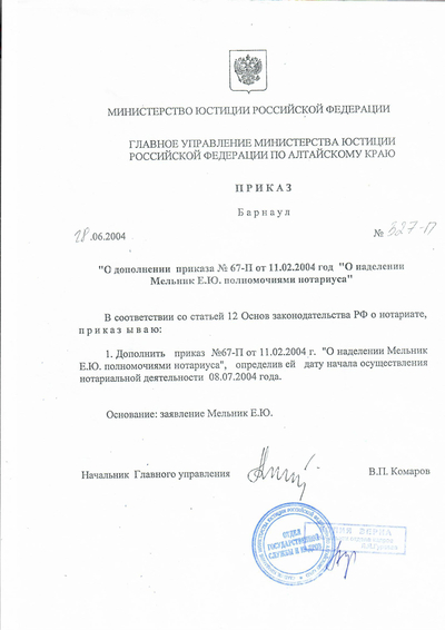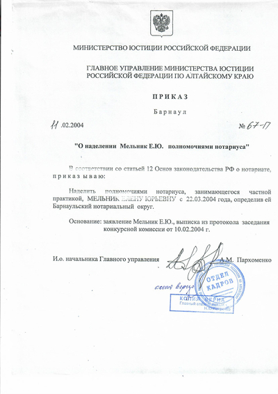 Приказ Главного управления Министерства юстиции Российской федерации по Алтайскому краю «О наделении Мельник Е.Ю. полномочиями нотариуса» № 67-П от 11.02.2004 г.
